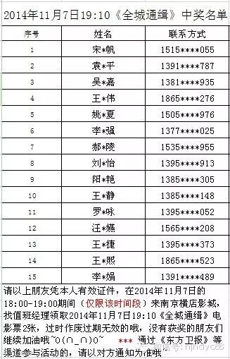 亲们~获得本期【免费看电影】的亲们(见图片),请您在2014年11月7日当天的18:00-19:00期间,来南京横店影城找值班经理领取2014年11月7日19:10《全城通缉》电影票2张,过时无效,过期作废。