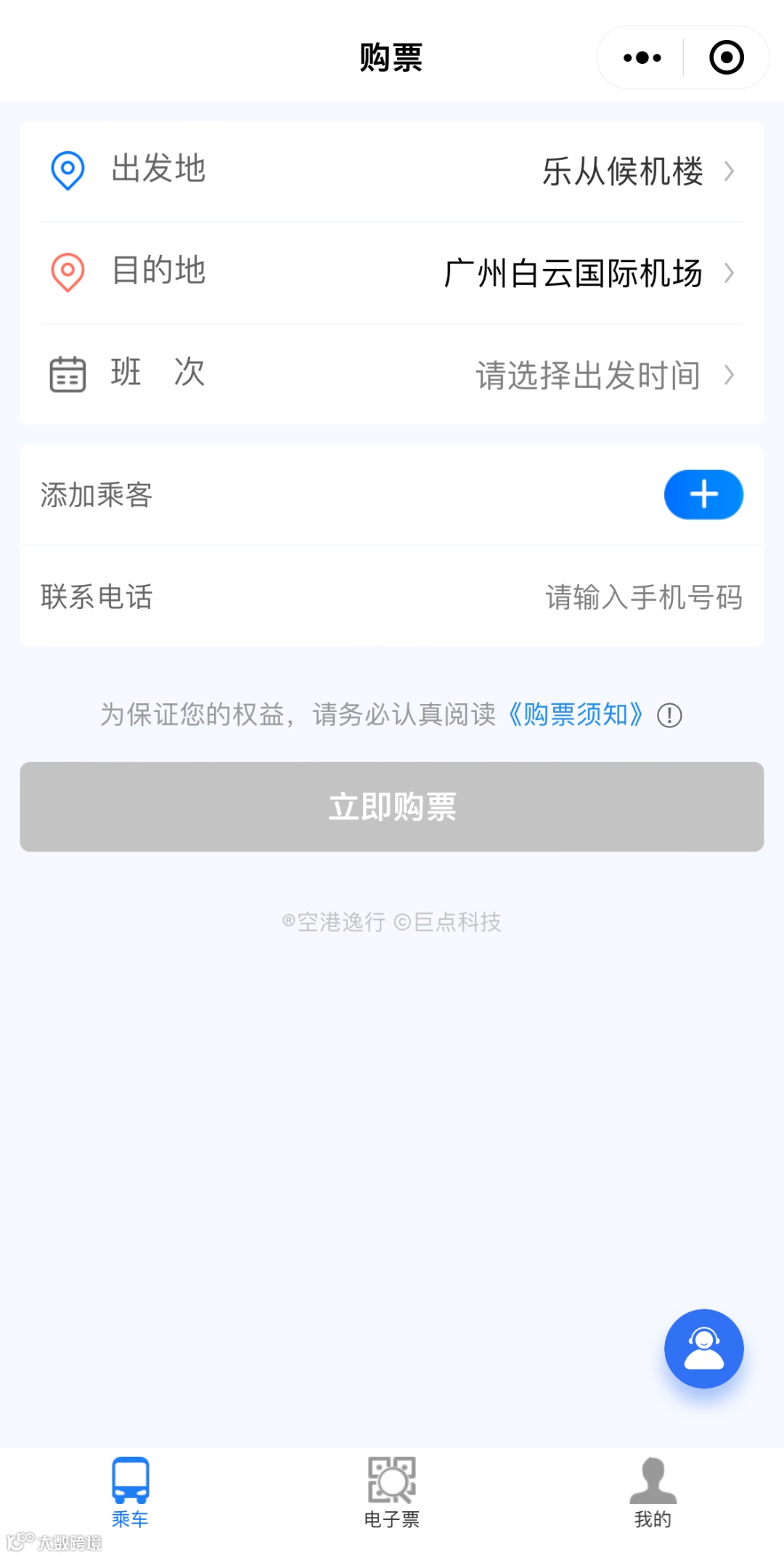 第二步:点击“出发地”选择【乐从候机楼】, 目的地选择【广州白云机场】,选择乘车班次和填写个人信息即可购票成功只需两步操作,市民旅客即可通过线上订票!
