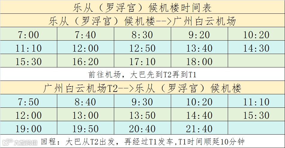备注:乐从(罗浮宫)候机楼出发的大巴需经停佛山候机楼,全程到达机场需时约90分钟。