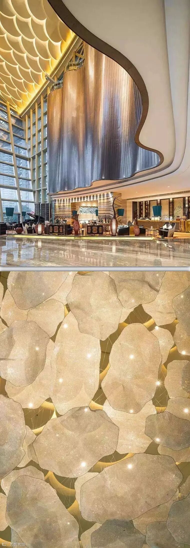 酒店大堂设计巧妙利用弧形墙面,处理成波澜壮阔的瀑布,与流水状的地砖和鱼鳞状天花,勾勒出鱼跃西江的画面。