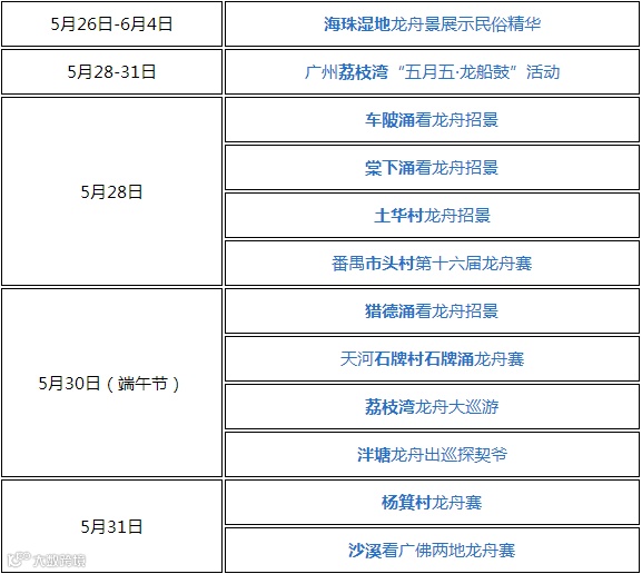 时间:四月三十(5月25日9:00)举办龙舟赛,五月初三(5月28日)龙船招景