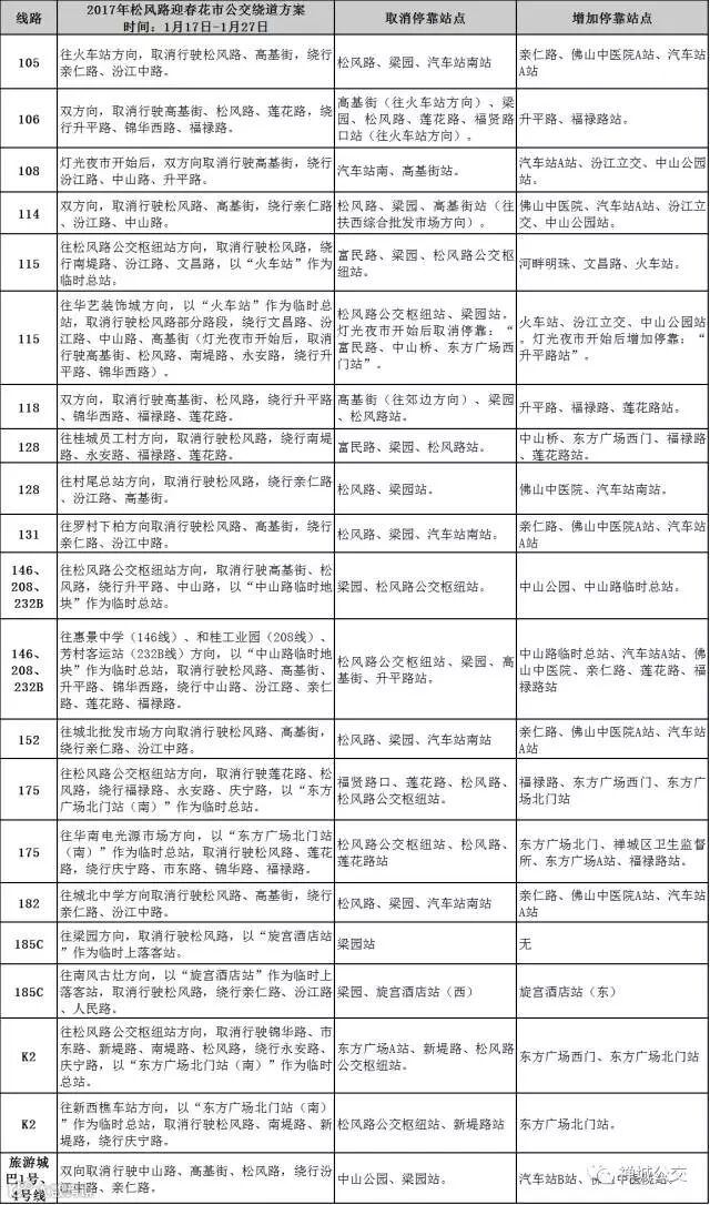 由于要进行花市基础设施的建设,松风路(筷子路至高基街段)需由1月17日起至1月27日实施交通管制,公交105、146、175、208、旅游城巴1、4号线等共18条线路需作临时绕道行驶。