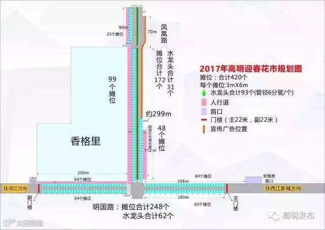 地点:西江新城明国路及凤凰路北段,其中明国路摊位长度为760米,凤凰路摊位长度为520米,摊位总长度为1280米。