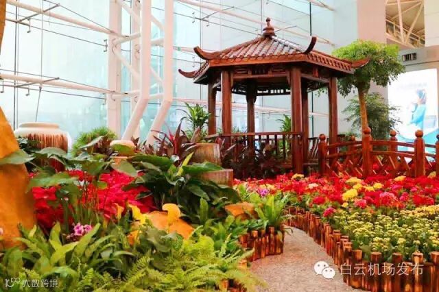 由于广州地处亚热带,长夏暖冬,一年四季草水常绿、花卉常开,自古就享有“花城”的美誉,广州人种花、爱花、赏花和赠花的历史悠久。因此,深秋的广州白云依然美丽动人——航站楼内繁花似锦,饰有亭台楼榭,从细节上诠释了广州“花城”特色。
