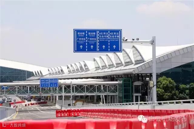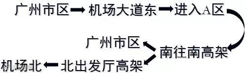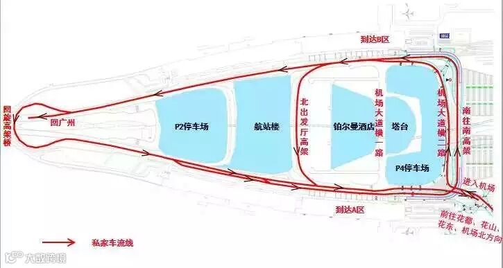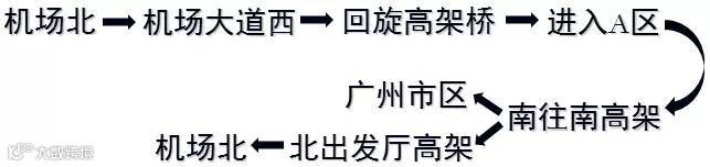 其中,A区所有接客社会车辆将通过南往南高架桥返回广州;需要前往北工作区、花山和花东方向的车辆,在A区出场后需经南往南高架下桥后,再上航站楼北出发厅高架掉头,重新进入主干道,接驳北临时进场路前往北工作区、花山和花东方向。