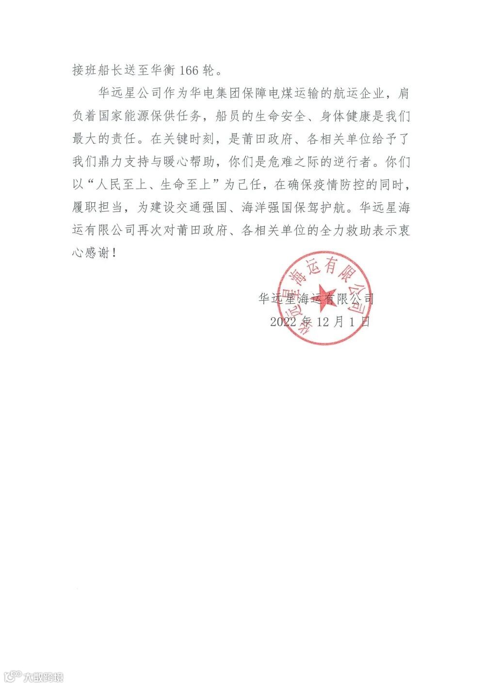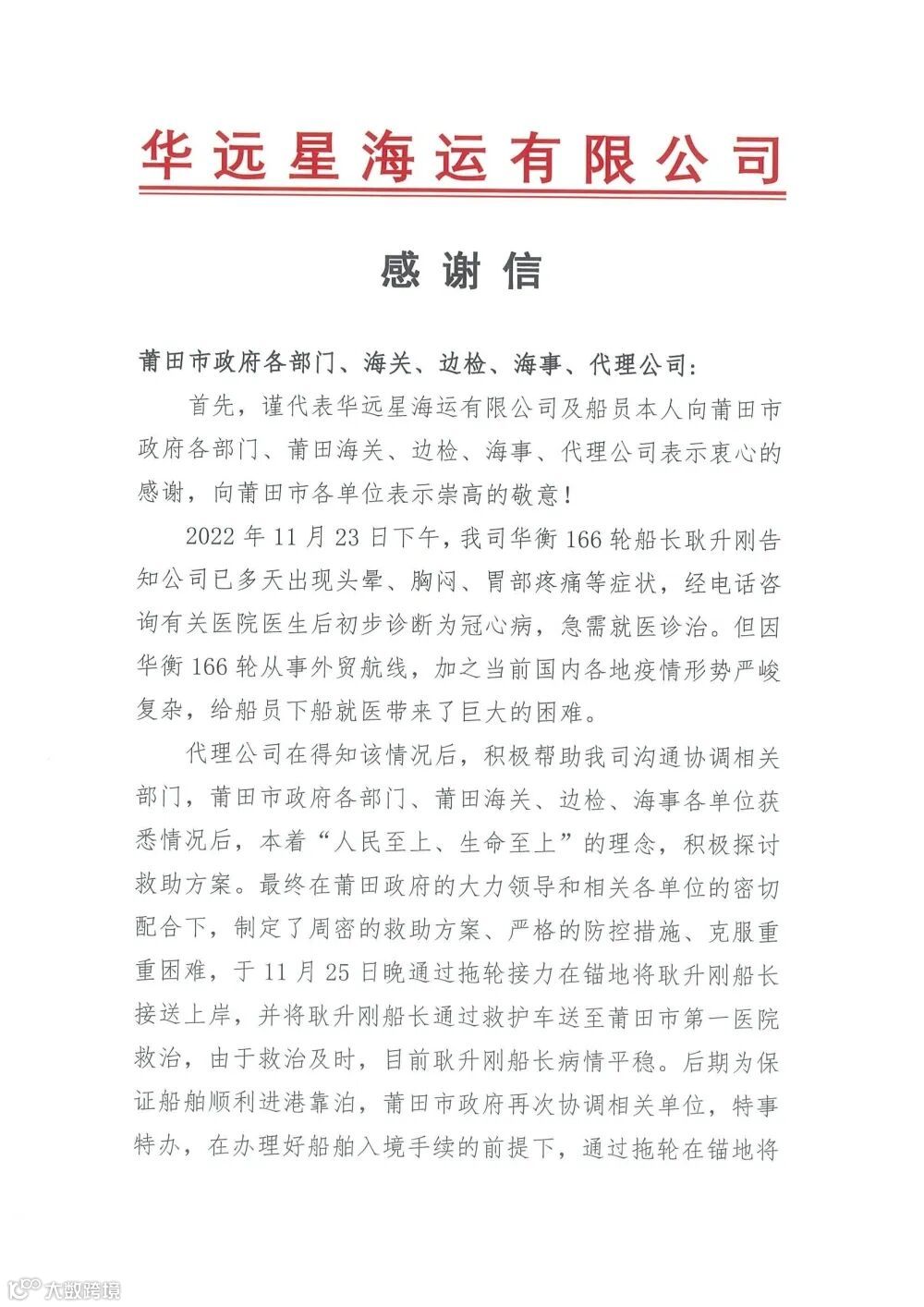 福建外代莆田分公司秉承“专家型代理、人性化服务”的理念,始终将客户需求放在首位,积极应对疫情挑战,用有温度的贴心服务为船东排忧解难。近日,莆田分公司克服重重困难,争分夺秒协助船员紧急就医,保障船员顺利换班,安排船舶及时进港,赢得了船东的高度赞誉,获得了感谢信。