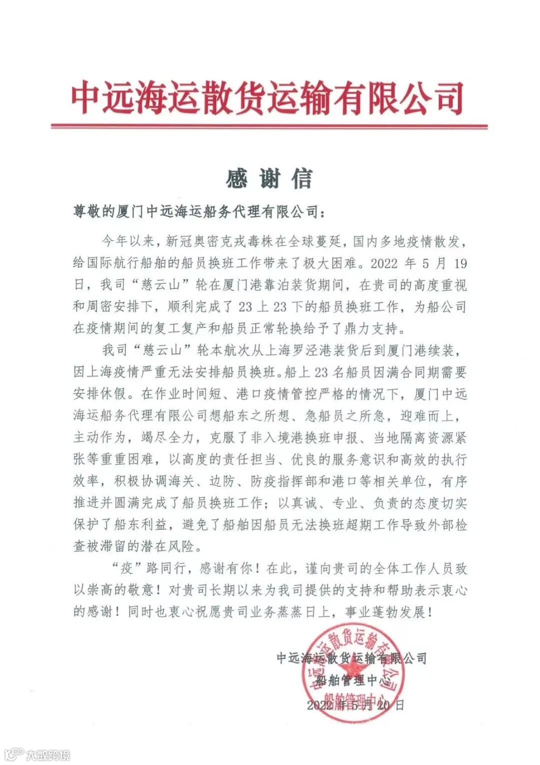 5月19日,“慈云山”轮在厦门港装货期间顺利完成了船员23上23下的换班任务。厦门中远海运船务周密的安排以及优质的服务,保障了船舶各项工作顺利开展,得到了船东的高度认可。
