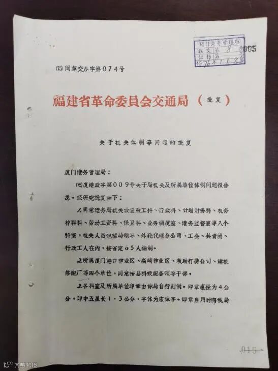 【1975年港务管理局机关体制变革后科室设立文件】