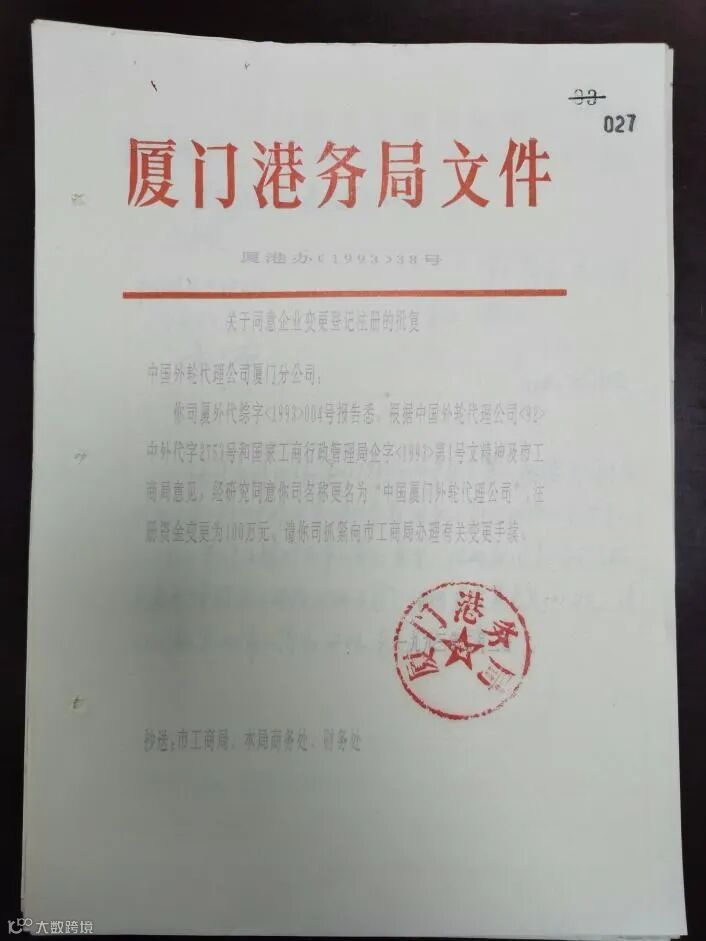 1993年3月,厦门港务局根据国家工商行政管理局《关于中国外轮代理总公司下属各分公司名称规范意见的通知(1993年第1号文)》和厦门市工商局意见,同意中国外轮代理公司厦门分公司正式更名为“中国厦门外轮代理公司”,注册资金增加到100万元人民币。