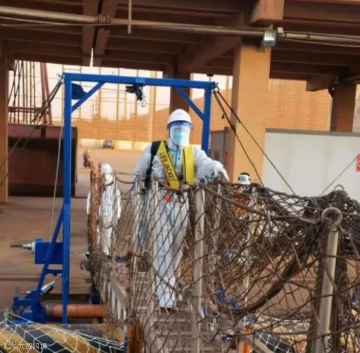 图为王俊鹏在罗屿码头进行铁矿船“天山轮”登轮作业。
