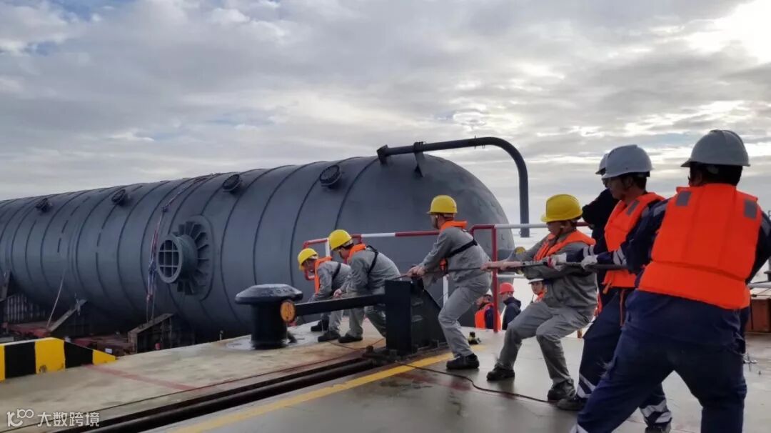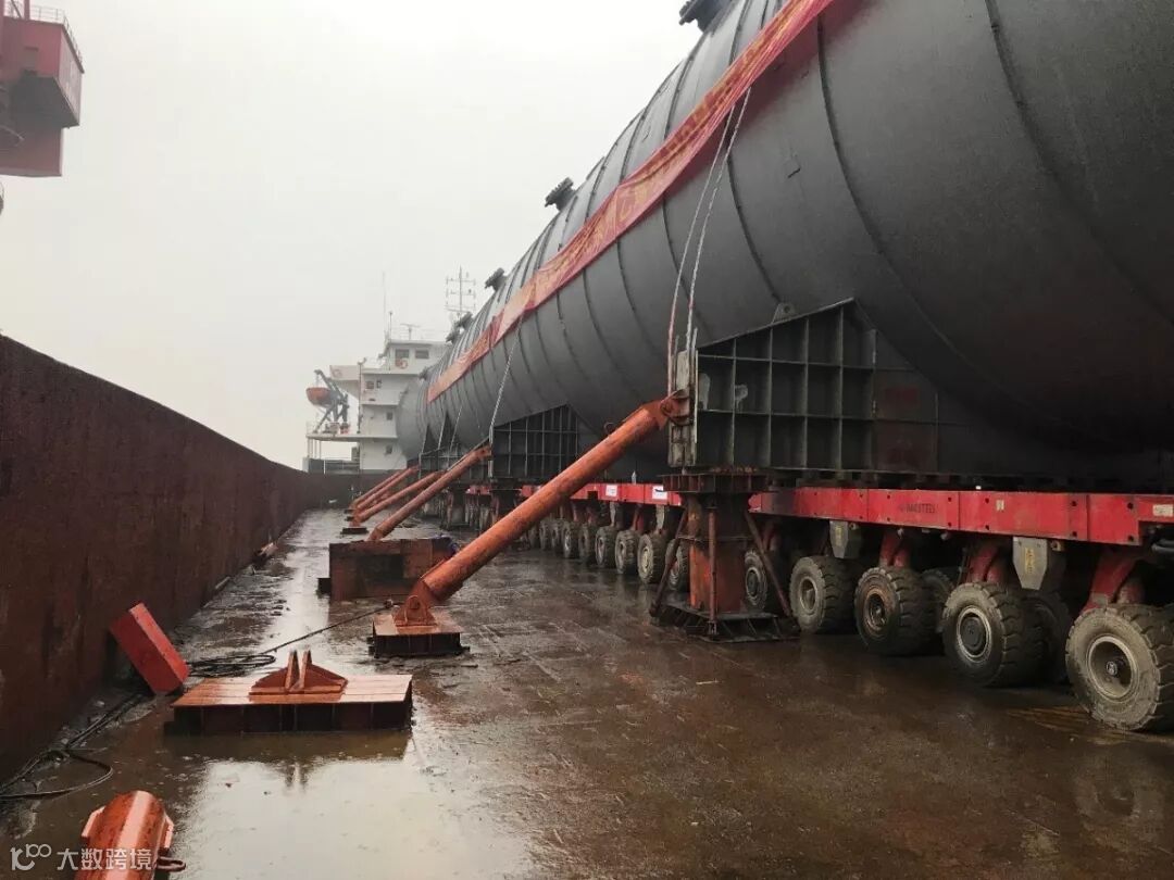2号丙烯精馏塔是中化泉州乙烯项目有史以来最长、最重设备,货物直径10.8米,长度115.35米,单件重2200吨,属于大型超限设备,对物流运输和节点控制要求极为苛刻,加上作业期间当地风力均达到8-9级,大大增加了现场操作的难度系数。为了确保项目核心设备的运输进度,厦门中远海运物流技术团队迎难而上,通过精准计算反复验证,最终确定作业期内每天仅有四个小时适合滚卸操作,在这仅有的时间窗口期,项目组成员展开了一场与时间的赛跑:项目组根据货物特点设计斜撑插销式固定设备的海绑方案,在靠泊后1小时之内迅速完成解绑工作;除此之外,将SPMT车辆置于设备鞍座底部随船运输,大大缩短目的港拼车和空车上船对位以及车上绑扎固定时间;在卸货码头,技术人员通过钢架架设路基板和钢板放缓坡度,以最高效、最经济、最安全的运输方案解决了卸货码头较大坡度导致设备触底的难题。
