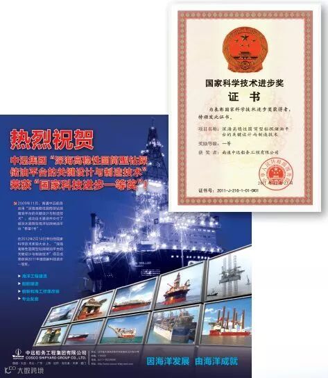 2012年2月14日,国家科学技术奖励大会在京召开,“深海高稳性圆筒型钻探储油平台的关键设计与制造技术”项目获2011年度国家科技进步一等奖。这是中远海运在科学技术领域获得的最高奖项,也是国内装备制造企业首次获得的国家科技殊荣。