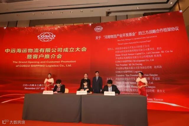 图为中远海运物流、中远海运发展有限公司、河南省农业综合开发公司签署关于 “河南物流产业开发基金”的三方战略合作框架协议。