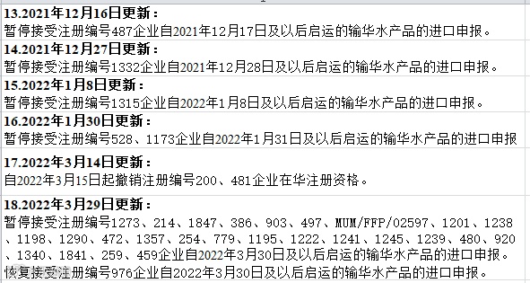 暂停接受注册编号1273、214、1847、386、903、497、MUM/FFP/02597、1201、1238、1198、1290、472、1357、254、779、1195、1222、1241、1245、1239、480、920、1340、1841、259、459企业自2022年3月30日及以后启运的输华水产品的进口申报。恢复接受注册编号976企业自2022年3月30日及以后启运的输华水产品的进口申报。