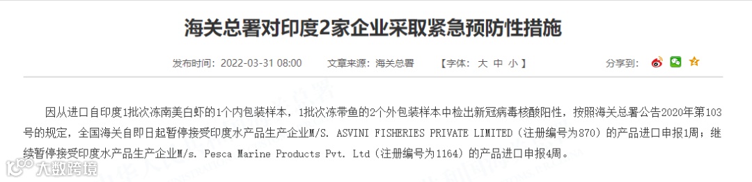 3月31日,海关总署通报了对印度2家企业采取紧急预防性措施,涉及到印度白虾、带鱼。相关原文如下:
