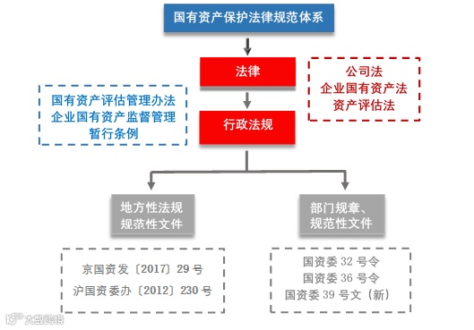 从上图中我们能很清晰地看到,在整个国有资产保护法律规范体系中,首先是国有资产管理的基本法—《企业国有资产法》,其旨在“巩固和发展国有经济,加强对国有资本的保护”。此外,诸如公司法、资产评估法等法律亦与国有资产管理与保护息息相关。