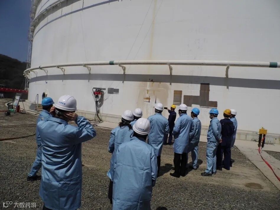 调研过程中,兴海公司的外壁防腐机器人水雾喷砂作业吸引了调研组的眼光。外壁防腐机器人以中化兴海自行设计制造的结构连接件、水雾喷砂枪头为核心,以圣瑞机器人为载体,历经联合团队一年的努力最终研制成功。本次观摩的外壁防腐机器人正在库区中开展储罐外壁防腐试验。