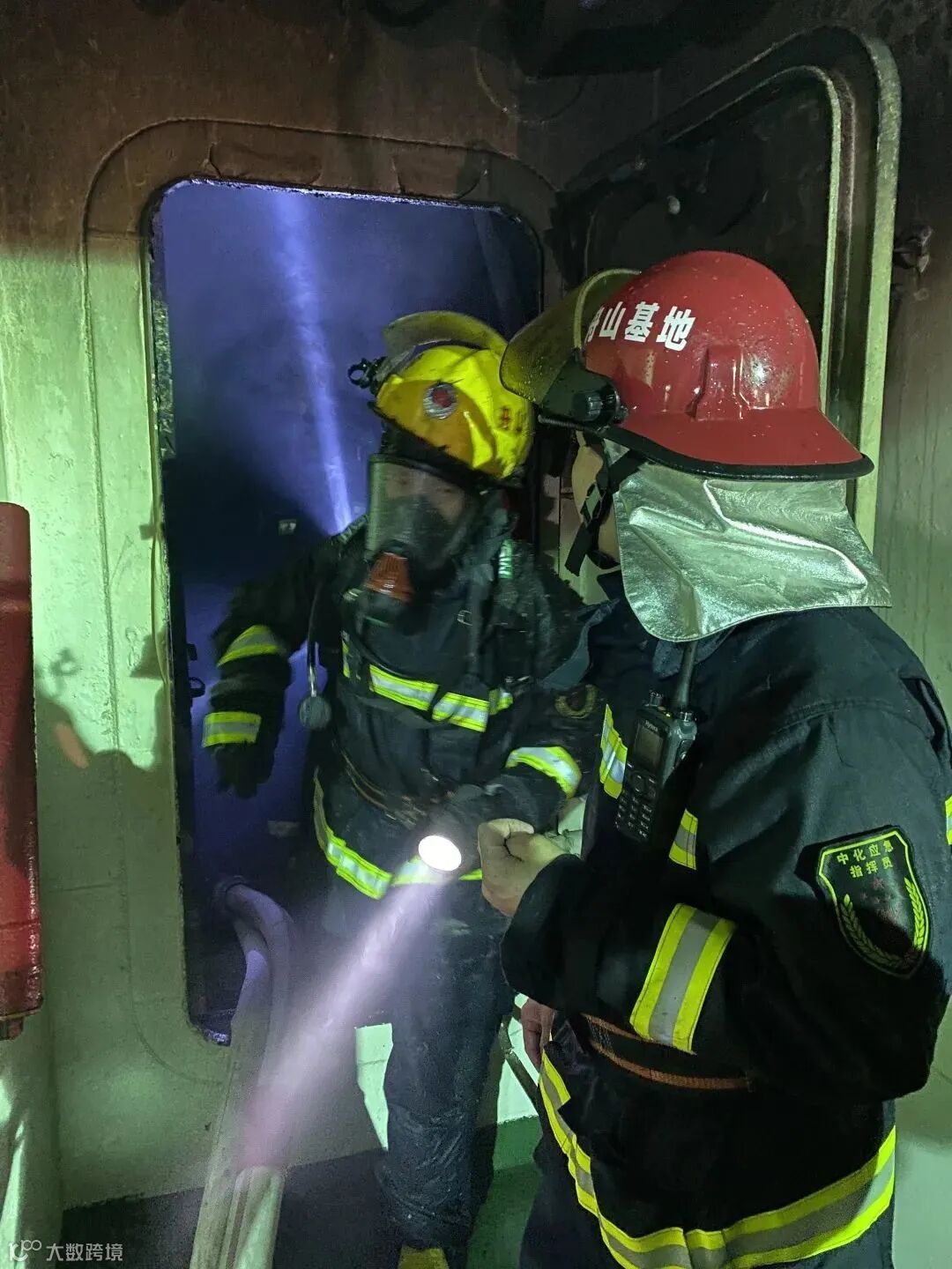 17时,中化舟山队2个侦察小组观察到烟气夹杂灰分,判断属于非液体蒸发类火灾,具备开启密闭门内攻条件。指挥果断下令2个内攻小组相互保护,梯次进攻,对着火船只实施内攻作战。