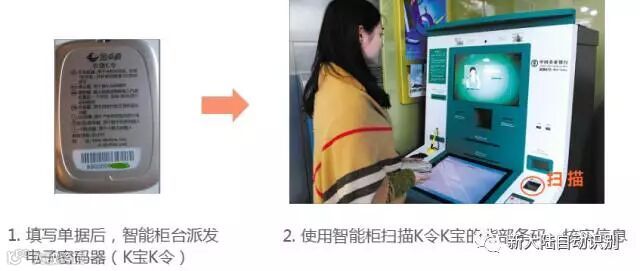 面临需要办理电子银行的开户业务时,智能柜台会派发电子密码器,消费者扫描该密码器的背部条码进行签约注册绑定,有效核实办理人身份的唯一性。