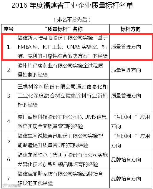 本刊讯:福建省经信委日前公布2016福建省“工业企业质量标杆”排行榜,新大陆电脑公司荣获质量管理方向第一名。专家组认定新大陆多项质量管理经验具有推广学习的意义: