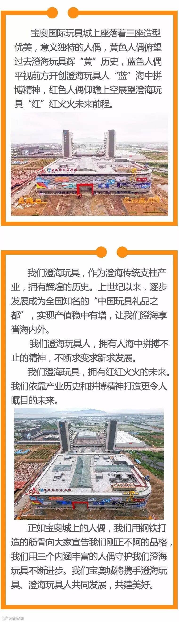 导读:奥国际玩具城上座落着三座造型优美,意义独特的人偶,黄色人偶俯望过去澄海玩具辉“黄”历史,蓝色人偶平视前方开创澄海玩具人“蓝”海中拼博精神,红色人偶仰瞻上空展望澄海玩具“红”红火火未来前程。