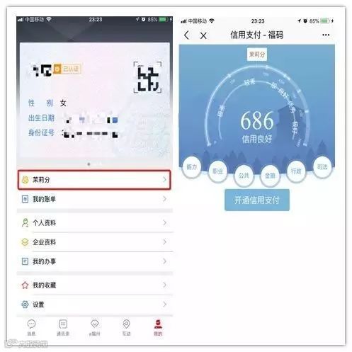 实名认证后点击app最下方的“我的” 中的“茉莉分”即可查看个人信用积分“茉莉分”。