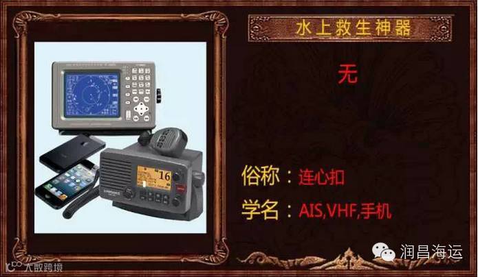 |学名|:甚高频无线电话(VHF),船舶自动识别系统(AIS),手机。用于近海和沿岸通信的救生神器,使船舶间、船岸间连结在一起。