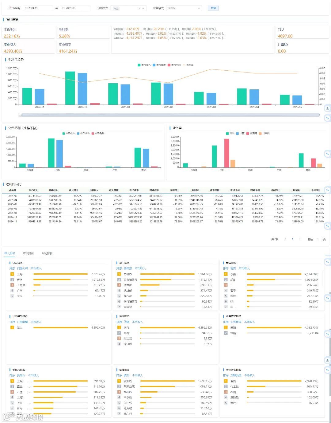 b、多维度排名分析:涵盖公司排名(按TEU)、销售部排名等,多维度呈现业务贡献度。