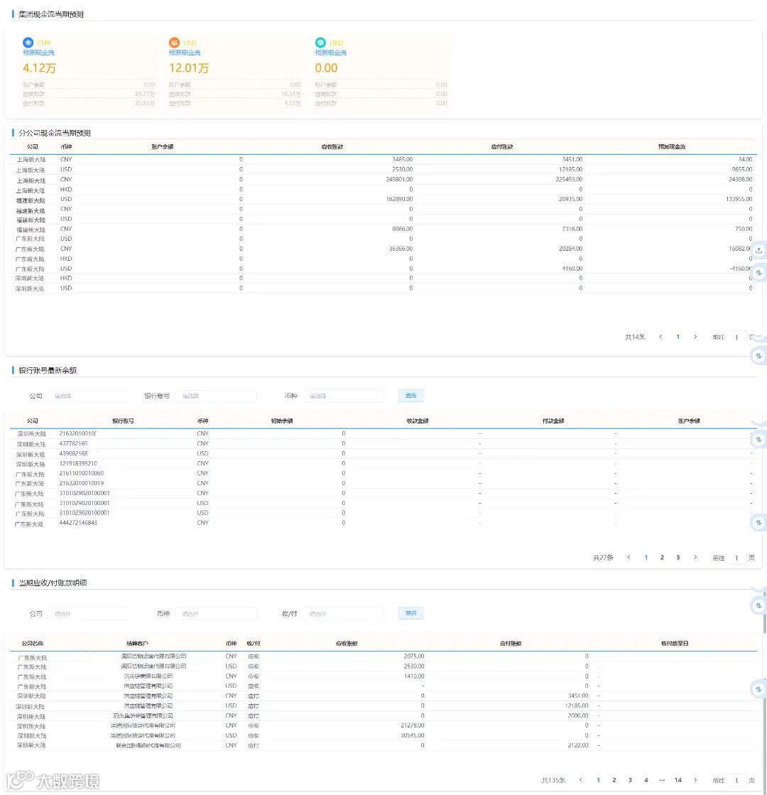 a、现金流预测分析:提供集团及分公司现金流当前预测,涵盖账户余额,应收账款,应付账款等关键数据,助力企业提前预警资金风险;