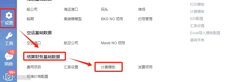 登入系统后,在左侧菜单栏找到【设置】-【结算财务基础数据】,单击【计费模板】进入具体页面后,点击【新增计费模板】即可新增