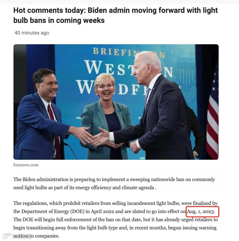 据悉,美国能源部于2022年4月确定一项禁止零售商销售白炽灯泡的规定,该禁令定于2023年8月1日生效。目前美国能源部已经敦促零售商开始过渡售卖的灯泡类型,并在最近几个月开始向各公司发出警告通知。