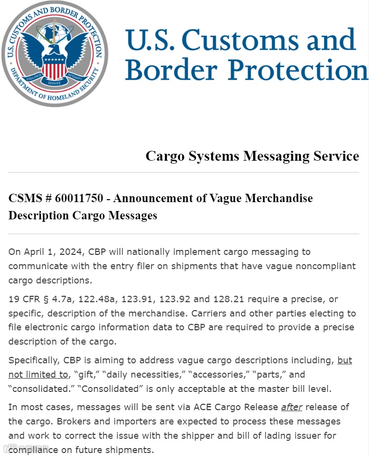 4月1日,美国海关和边境保护局(CBP)就针对“商品描述含糊”问题发布了公告,明确指出常见的模糊描述如“零件、配件、日用品、礼品”等货物将不再被接受。若货物分类不明确,可能会直接导致货物被扣押。