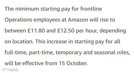 英国一线运营员工时薪上调至11.80英镑-12.50英镑。到2024年4月份,亚马逊还将进一步涨薪至每小时12.30-13.00英镑,具体涨幅也是取决于工人所处地区,至于是否包括英国考文垂仓库工人就不得而知了。