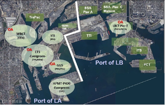目前美西主要的四大港口分别为:长滩港(LONG BEACH)、洛杉矶港(LOS ANGELES)、奥克兰港(OAKLAND)、西雅图港(SEATTLE)。其中长滩港及洛杉矶港为货柜吞吐量最大的两个港口,货柜装卸量占全美集装箱装卸量的40%左右。