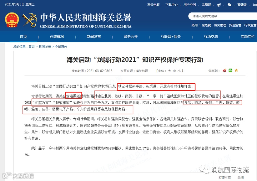 日前,海关总署发布公告,启动“龙腾行动2021”知识产权保护专项行动,锁定侵权新手法、新渠道,开展有针对性地打击。