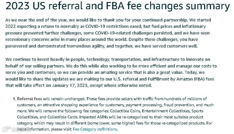 亚马逊公告中表示,2023年将提高和增收的有以下费用:亚马逊物流出库费、标准尺寸商品的月度非高峰仓储费、仓储使用附加费、超龄库存附加费、增加移除和处置费用。