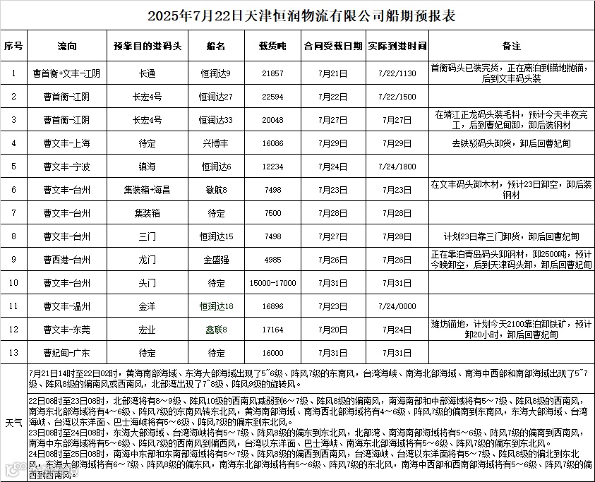 2025年7月22日船期预报