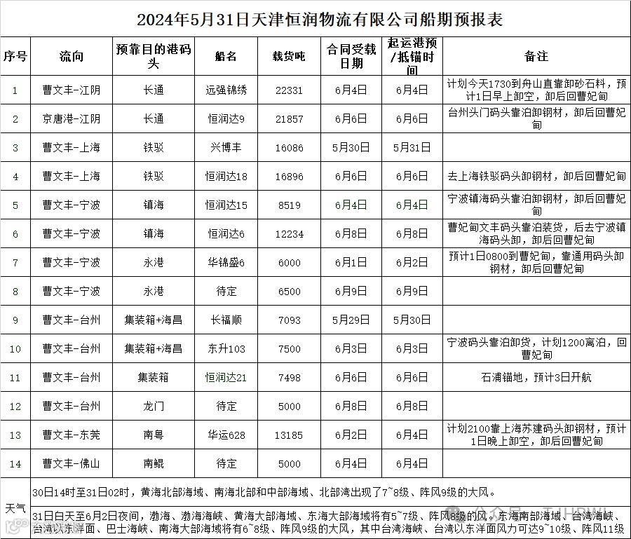 2024年5月31日船期预报