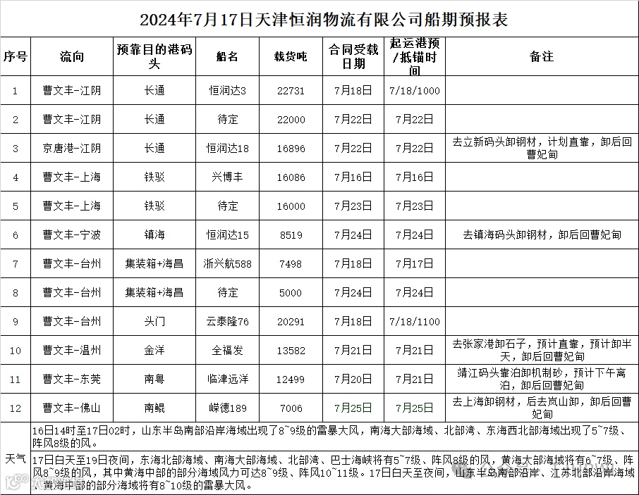 2024年7月17日船期预报