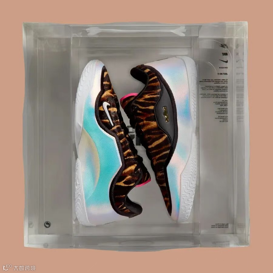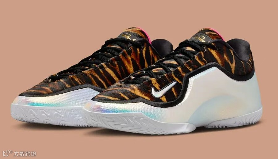 鞋面融合质感合成革与醒目虎纹,呼应那段充满野性与华丽的岁月。中足炫彩“王冠”饰片,灵感来自海洋大道的艺术光影。