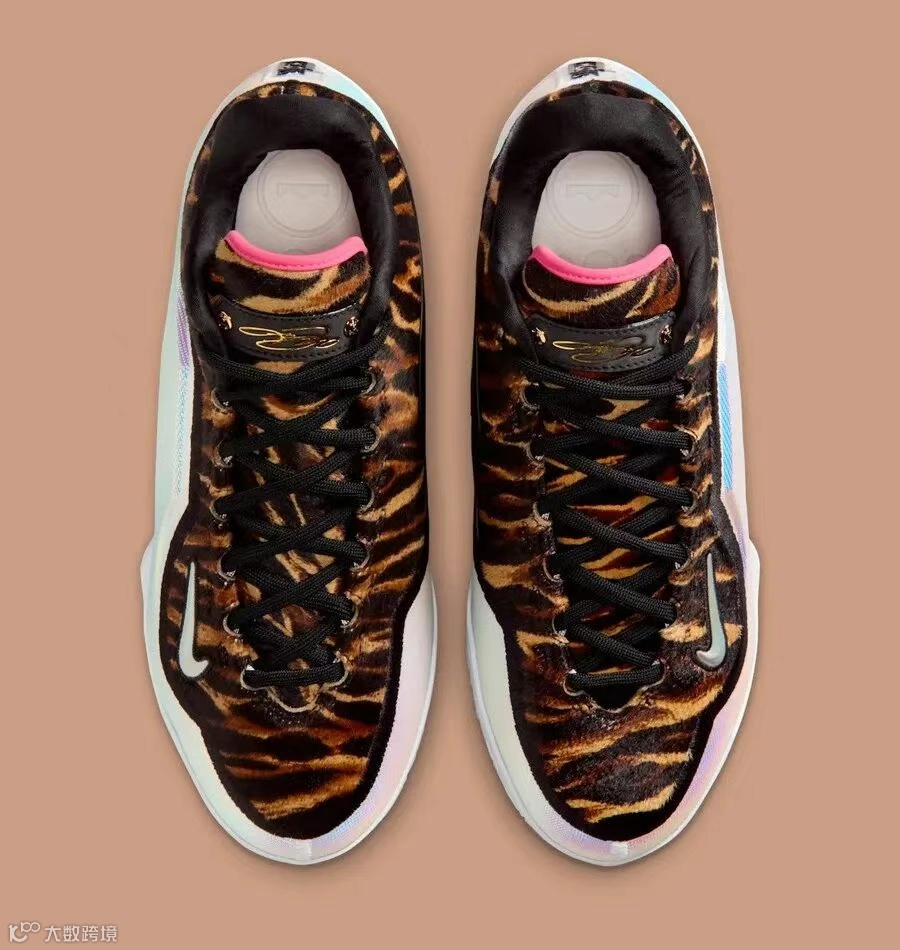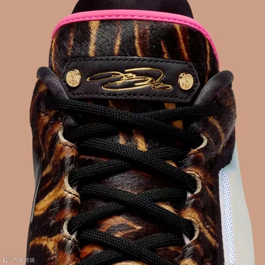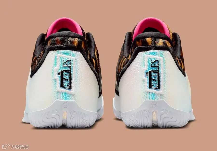 鞋身豹纹曾多次出现在 PE 配色中,细节点缀的粉色的南海岸装扮,后跟 Heatles 则是 Heat 与披头士乐队 The Beatles 的合体。