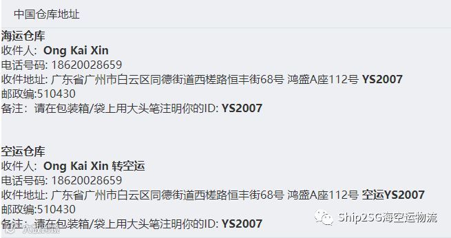510430 收件地址: 广东省广州市白云区同德街道西槎路恒丰街68号 鸿盛A座112号 空运YSXXXX (你的专属ID号码)