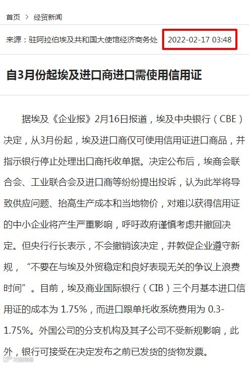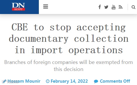 埃及中央银行(CBE)决定,从3月份起,埃及进口商仅可使用信用证进口商品,并指示银行停止处理出口商托收单据。