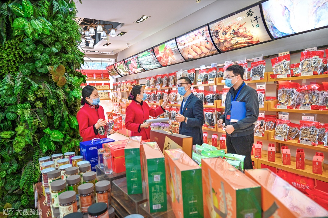 许福桥(左二)与巡察组干部走访辖区药店,督查职能部门在药品保供稳价方面的落实情况。