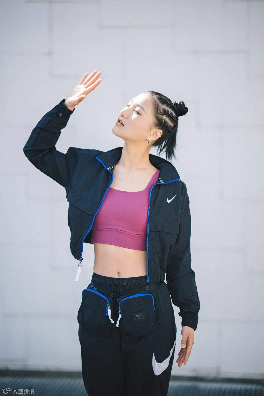 内搭暗红色bra,适当的露肤感提升腰线并展示出优美的曲线及白皙的肌肤。打造出健康阳光的氛围!