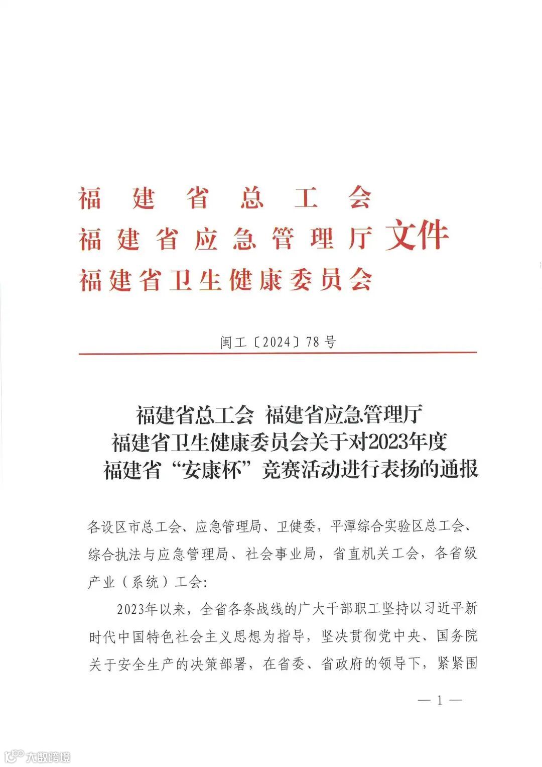 在2023年度福建省“安康杯”竞赛活动中,公司紧紧围绕“排查整治安全隐患、共促安全健康发展”主题,精心组织、周密部署,通过强化安全教育培训、健全安全生产体系、深入隐患排查治理等多元化举措,显著提升了员工的安全意识和实操能力,为公司安全生产构筑了坚实防线。日前,福建省总工会、福建省应急管理厅、福建省卫生健康委员会决定对福建福港拖轮有限公司进行通报表扬。