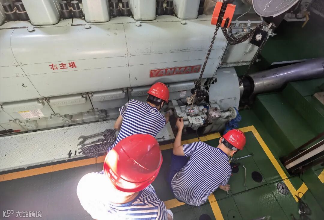 图为福港拖5启动马达故障,轮机员们齐上阵检修的场景