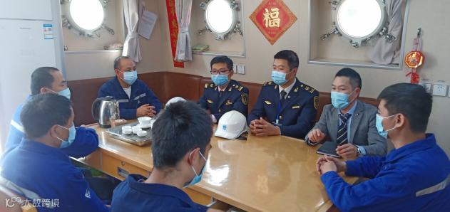 2月20日,福港拖轮宁德办事处邀请三都澳海事处船舶科科长李宗民、执法科检查官王方永在“福港拖6”轮开展安全共建活动。