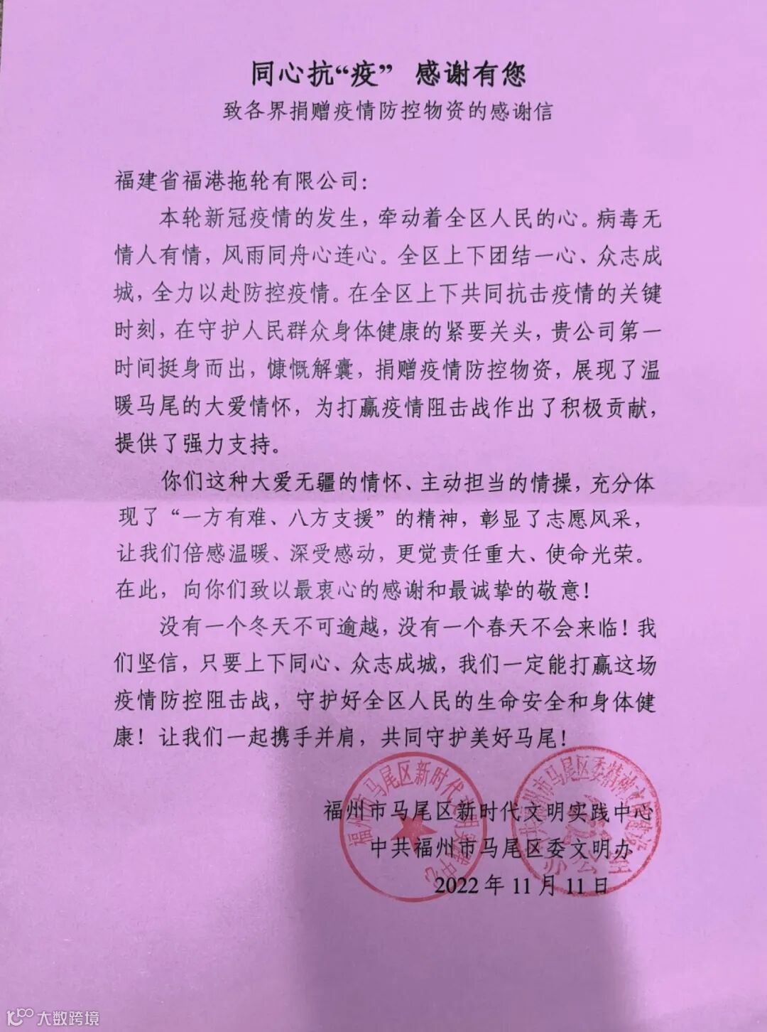 数寸笺纸,纸短情长。这封感谢信,不仅是对福港拖轮助力疫情防控的感谢,也是对福港拖轮积极承担社会责任的肯定。作为马尾区区级文明单位,福港拖轮将以党的二十大精神为指引,持续用实际行动践行使命担当,为打赢疫情防控持久战贡献国企力量。