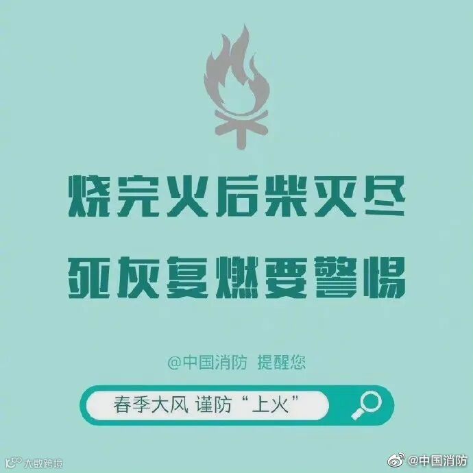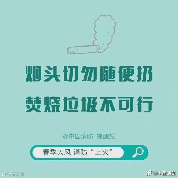 进入春季,气温回暖,然大风天较多,稍有不慎就会引发火灾事故。大家日常中一定要做好防范:烧完火后柴灭尽,野外山林勿带火,及时清理可燃物……还有哪些?看图~